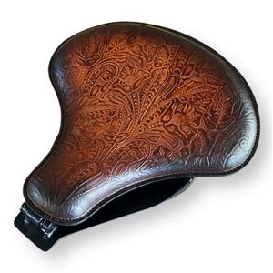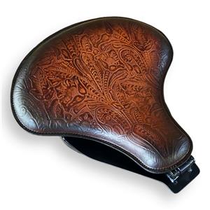 - This set includes a 15x14" Brown On Brown Tooled Embossed Leather seat, Spring solo seat and mounting kit